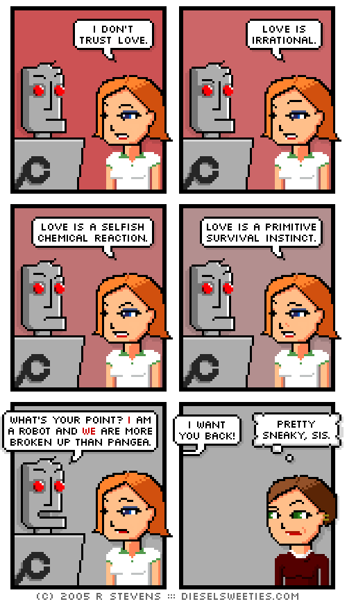 Diesel Sweeties is a pixelated webcomic by Richard Stevens 3 that has been running since April 2000. Sometimes the people kiss the robots.