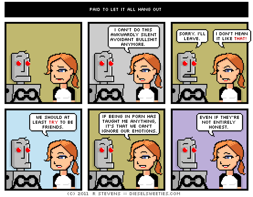 Diesel Sweeties is a pixelated webcomic by Richard Stevens 3 that has been running since April 2000. Sometimes the people kiss the robots.