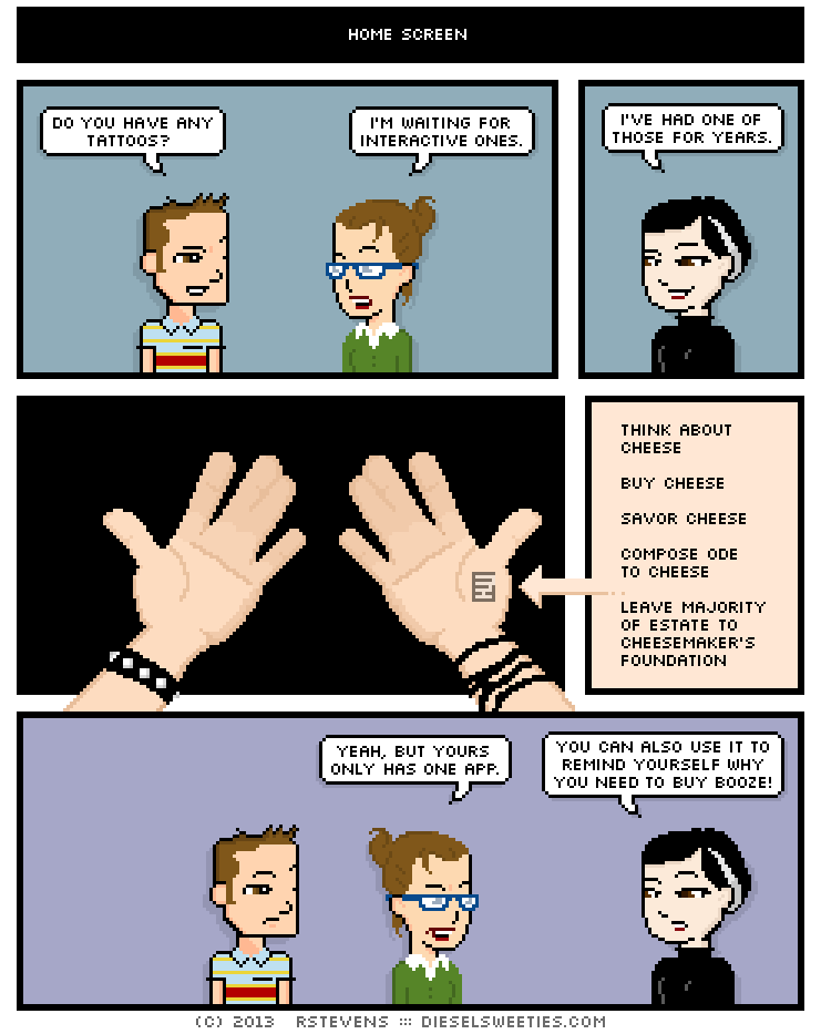 Diesel Sweeties is a pixelated webcomic by Richard Stevens 3 that has been running since April 2000. Sometimes the people kiss the robots.