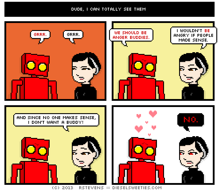 Diesel Sweeties is a pixelated webcomic by Richard Stevens 3 that has been running since April 2000. Sometimes the people kiss the robots.