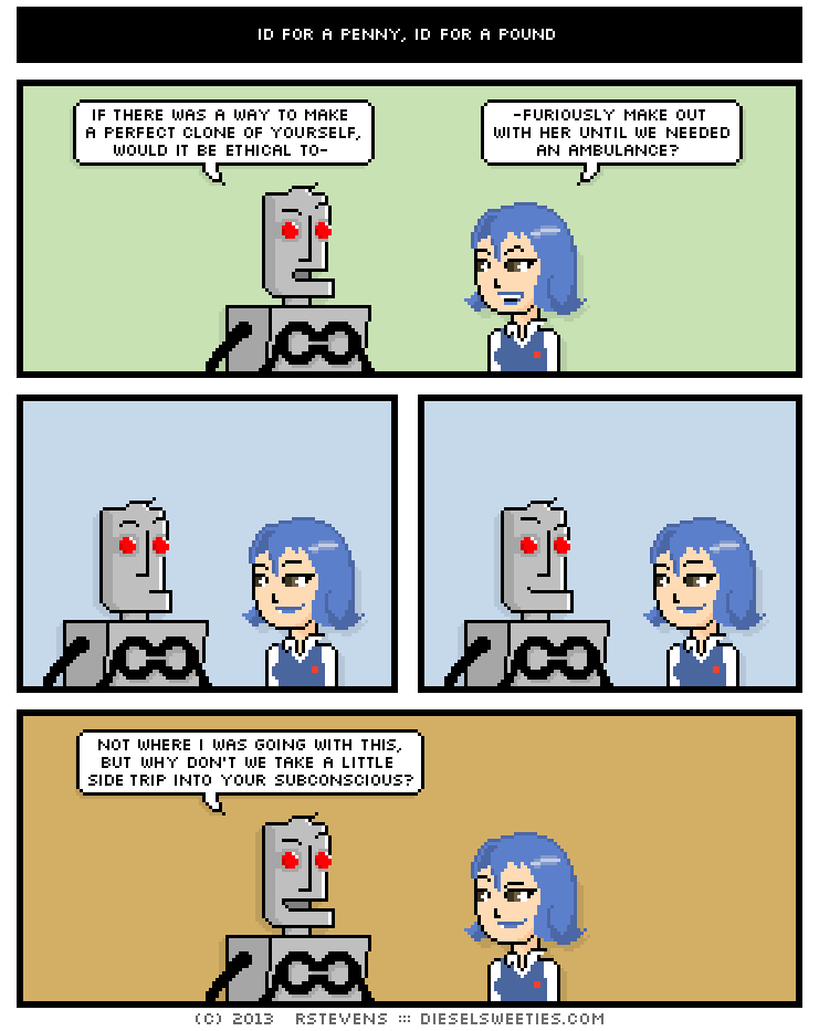 Diesel Sweeties is a pixelated webcomic by Richard Stevens 3 that has been running since April 2000. Sometimes the people kiss the robots.