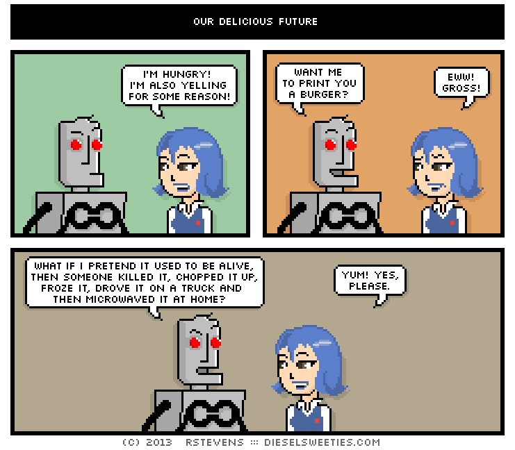 Diesel Sweeties is a pixelated webcomic by Richard Stevens 3 that has been running since April 2000. Sometimes the people kiss the robots.