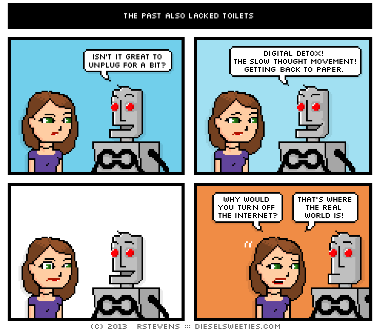 Diesel Sweeties is a pixelated webcomic by Richard Stevens 3 that has been running since April 2000. Sometimes the people kiss the robots.