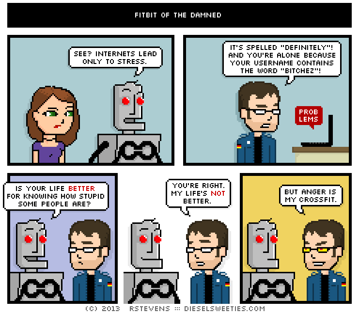 Diesel Sweeties is a pixelated webcomic by Richard Stevens 3 that has been running since April 2000. Sometimes the people kiss the robots.