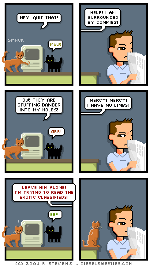 Diesel Sweeties is a pixelated webcomic by Richard Stevens 3 that has been running since April 2000. Sometimes the people kiss the robots.