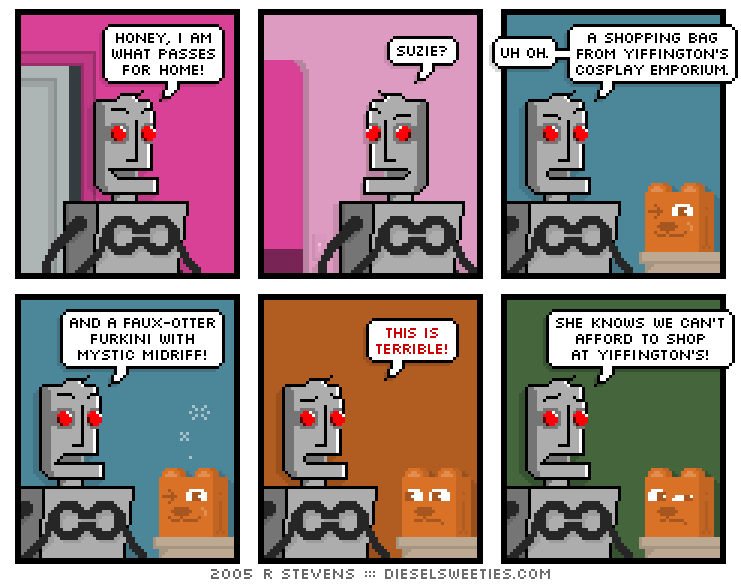 Diesel Sweeties is a pixelated webcomic by Richard Stevens 3 that has been running since April 2000. Sometimes the people kiss the robots.