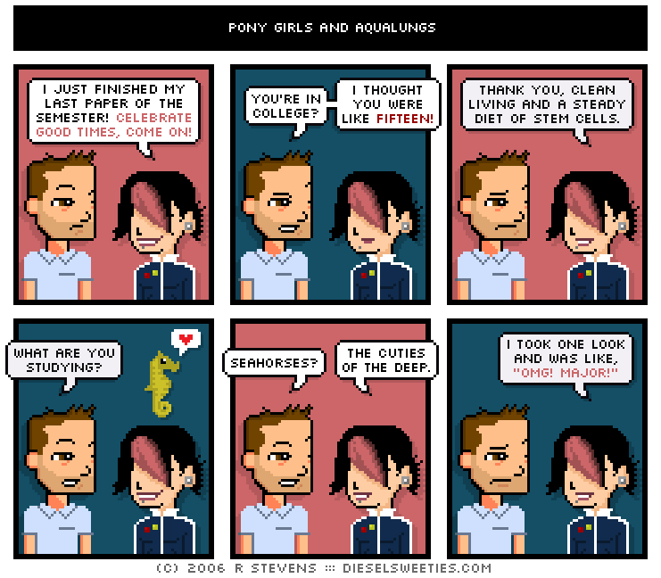Diesel Sweeties is a pixelated webcomic by Richard Stevens 3 that has been running since April 2000. Sometimes the people kiss the robots.
