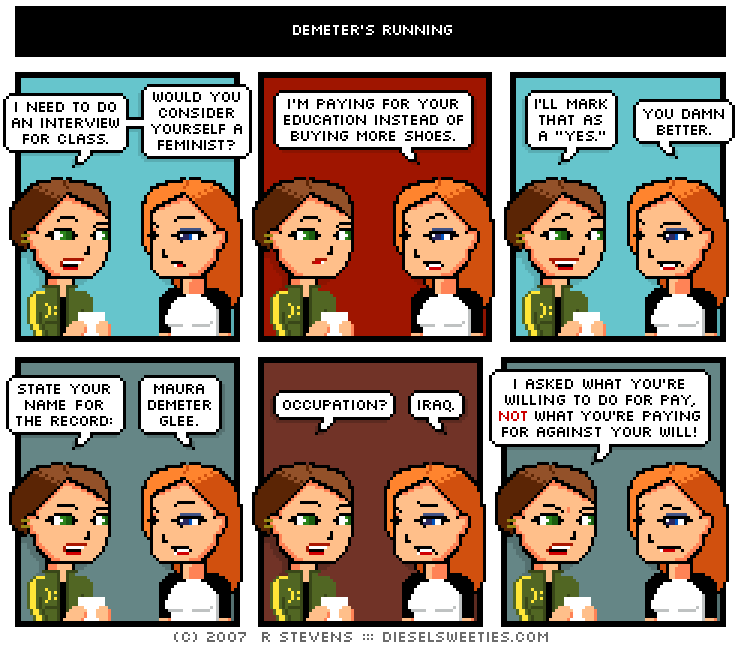 Diesel Sweeties is a pixelated webcomic by Richard Stevens 3 that has been running since April 2000. Sometimes the people kiss the robots.