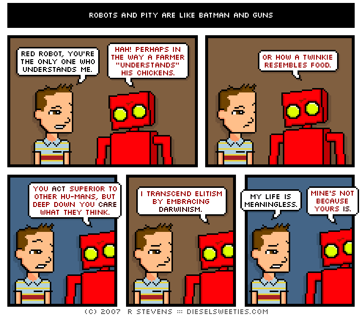 Diesel Sweeties is a pixelated webcomic by Richard Stevens 3 that has been running since April 2000. Sometimes the people kiss the robots.