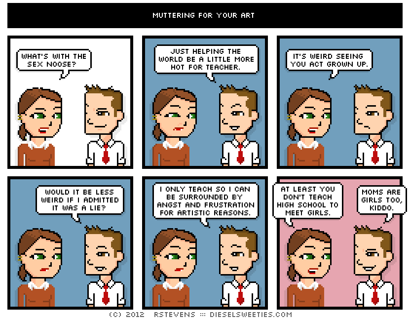Diesel Sweeties is a pixelated webcomic by Richard Stevens 3 that has been running since April 2000. Sometimes the people kiss the robots.