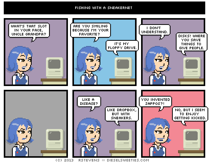 Diesel Sweeties is a pixelated webcomic by Richard Stevens 3 that has been running since April 2000. Sometimes the people kiss the robots.