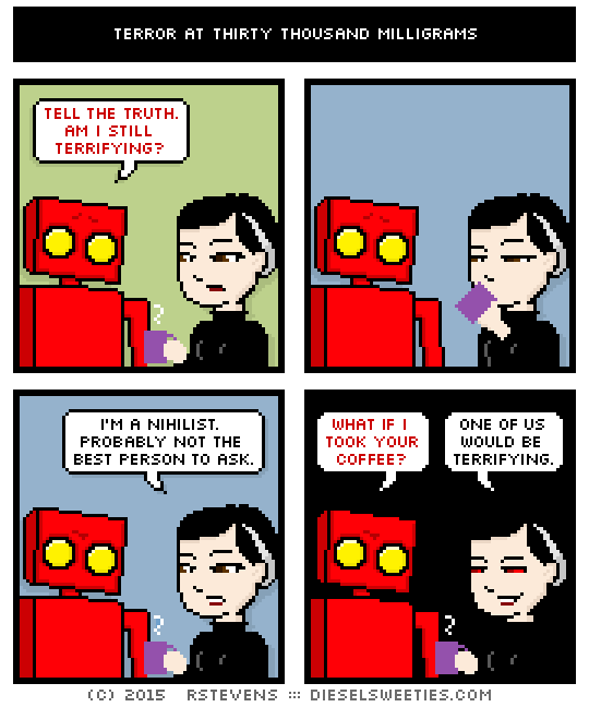 Diesel Sweeties is a pixelated webcomic by Richard Stevens 3 that has been running since April 2000. Sometimes the people kiss the robots.