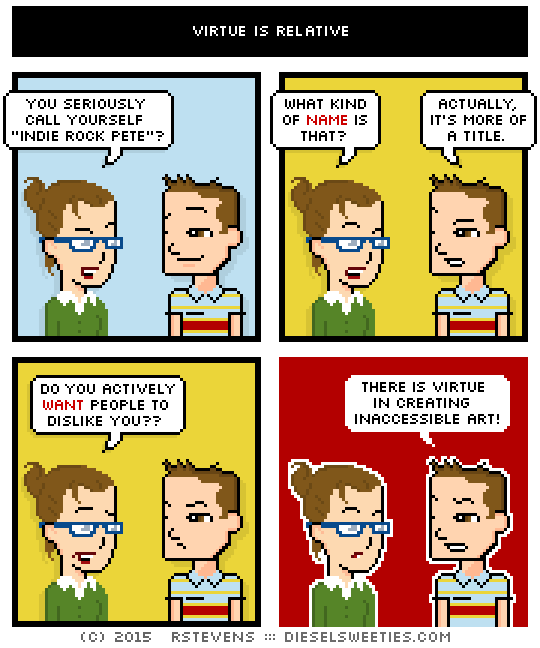 Diesel Sweeties is a pixelated webcomic by Richard Stevens 3 that has been running since April 2000. Sometimes the people kiss the robots.