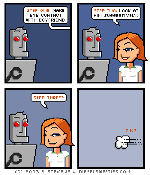 Diesel Sweeties is a pixelated webcomic by Richard Stevens 3 that has been running since April 2000. Sometimes the people kiss the robots.