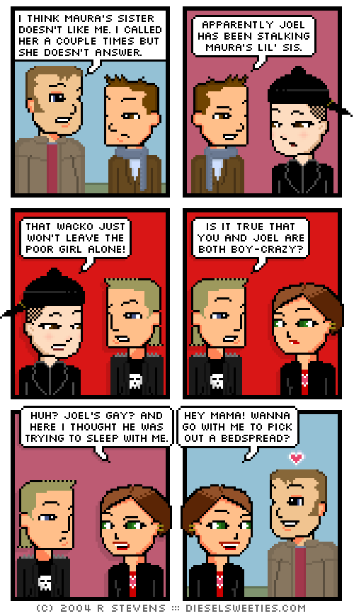 Diesel Sweeties is a pixelated webcomic by Richard Stevens 3 that has been running since April 2000. Sometimes the people kiss the robots.