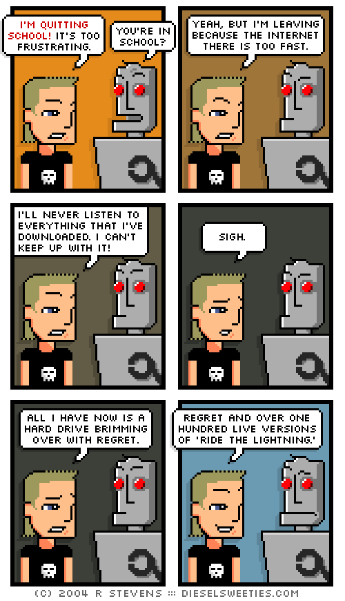 Diesel Sweeties is a pixelated webcomic by Richard Stevens 3 that has been running since April 2000. Sometimes the people kiss the robots.